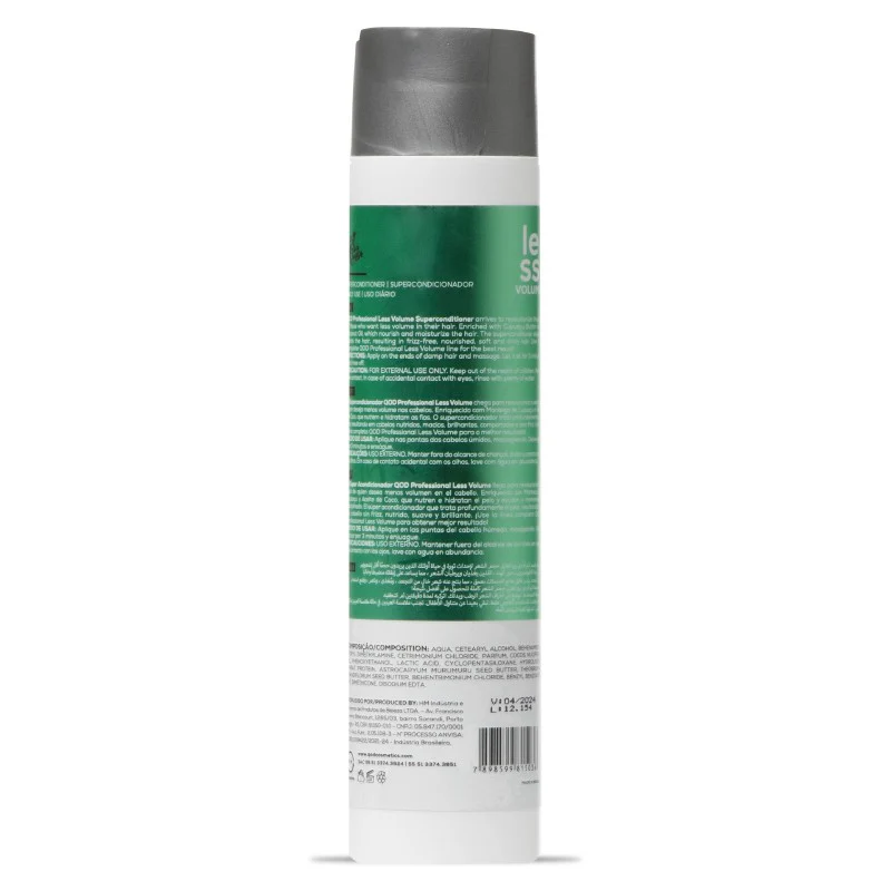 QOD Less Volume Conditioner 300ml: A professional-grade super conditioner enriched with Cupuaçu Butter and Wheat Protein. Designed to eliminate frizz and provide deep hydration, leaving hair soft, strong, and perfectly controlled with a brilliant shine.